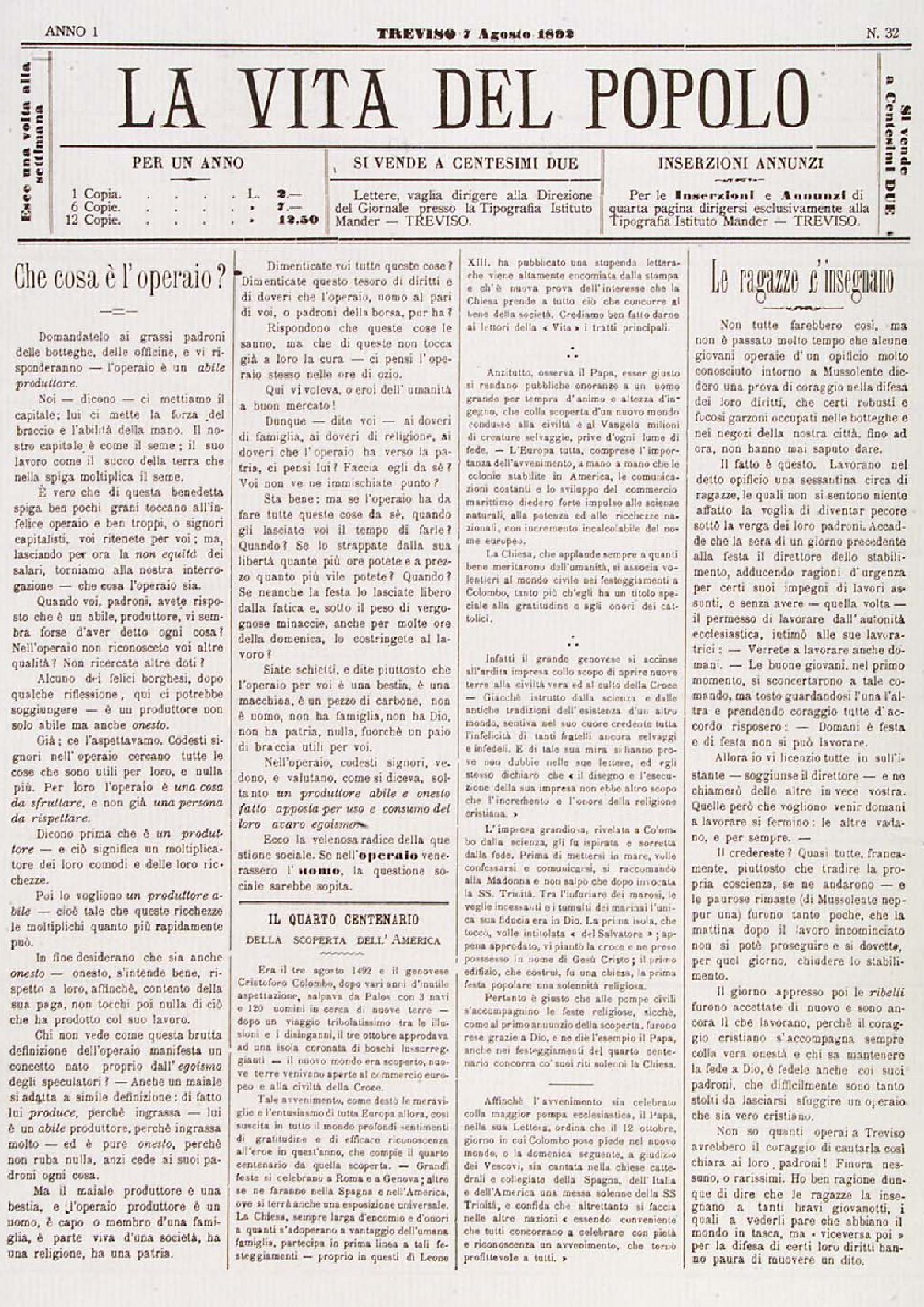 La Vita del Popolo n. 32 del 07/08/1892