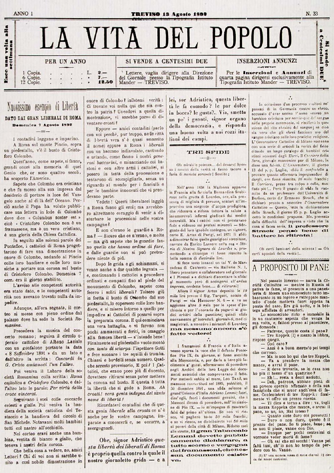 La Vita del Popolo n. 33 del 13/08/1892