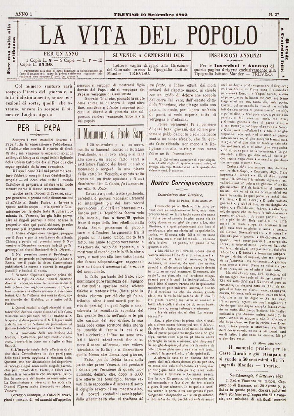 La Vita del Popolo n. 37 del 10/09/1892