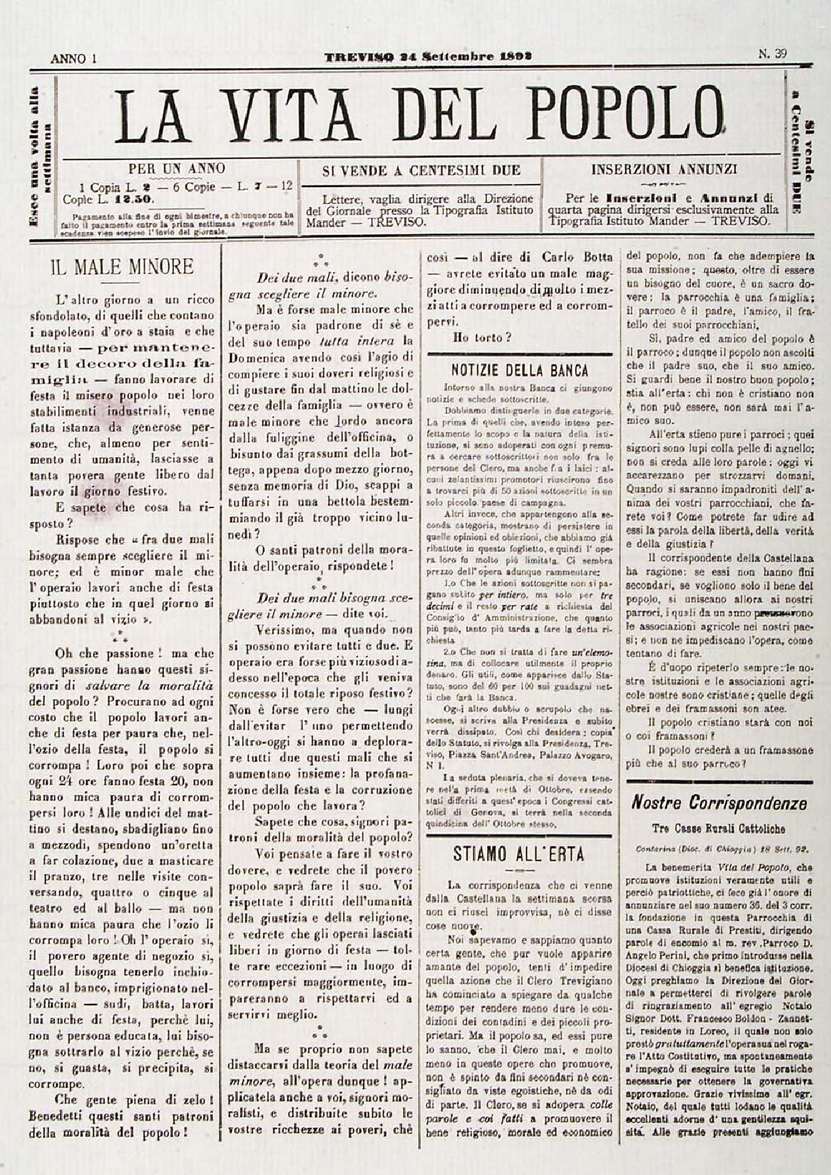 La Vita del Popolo n. 39 del 24/09/1892